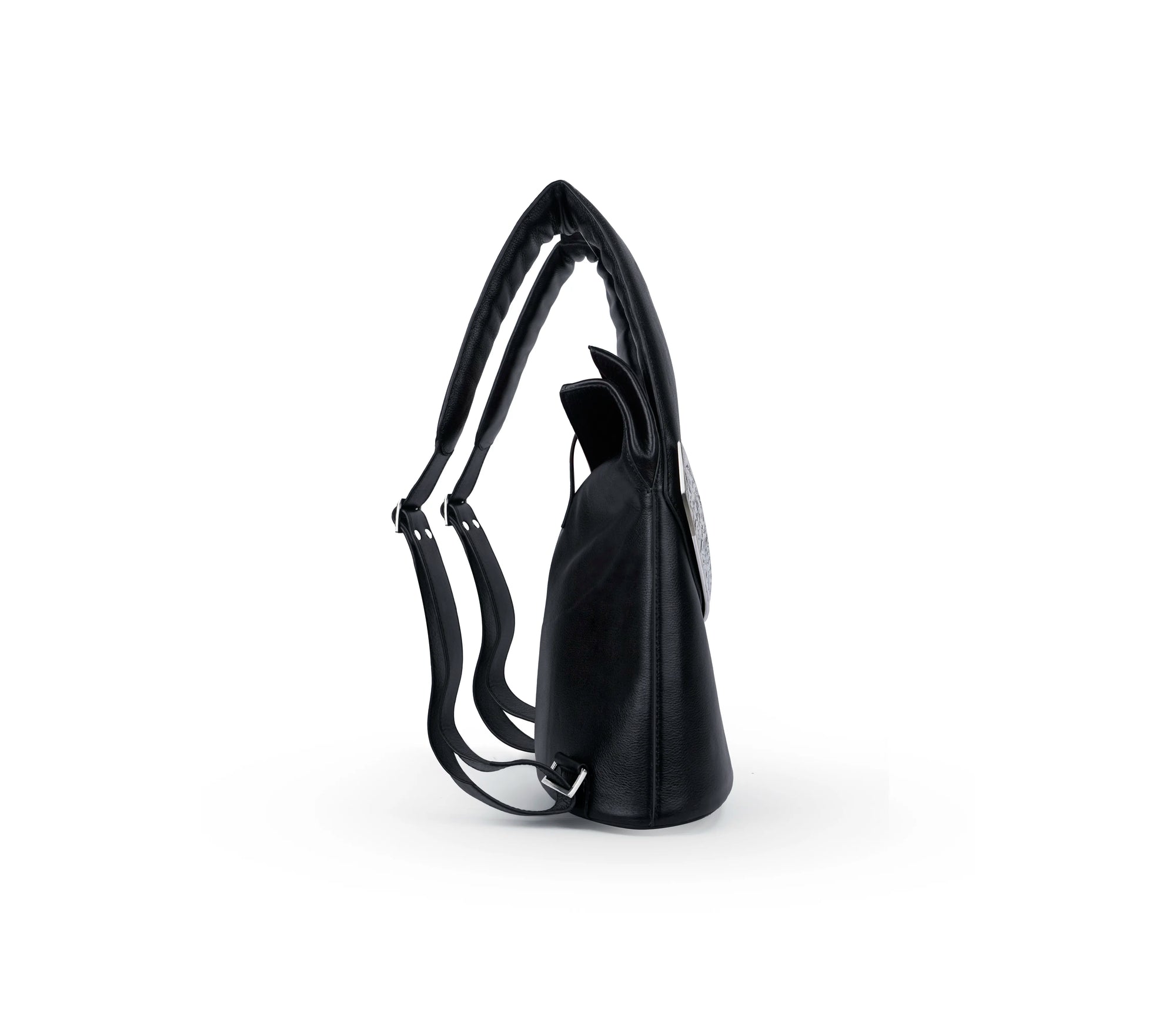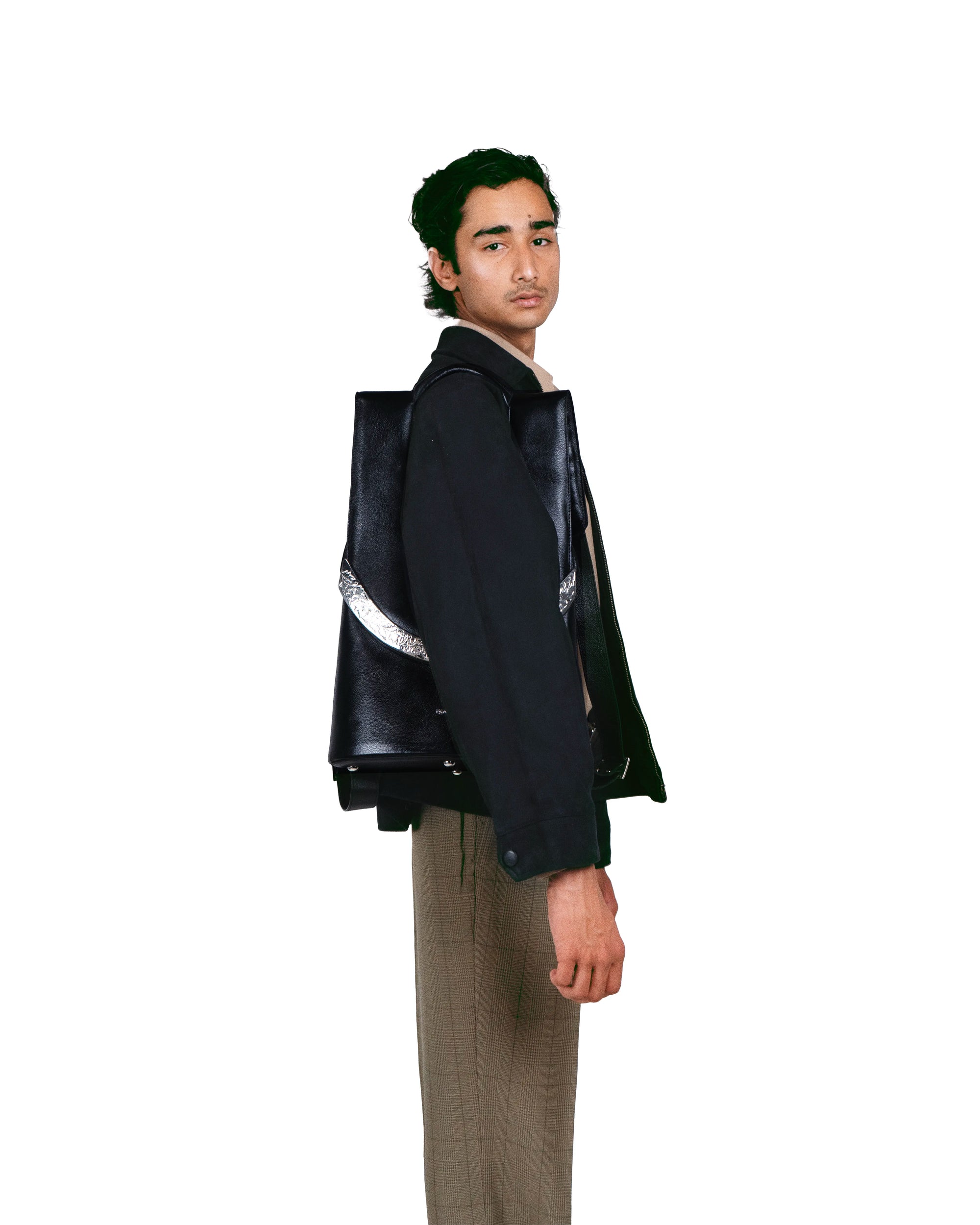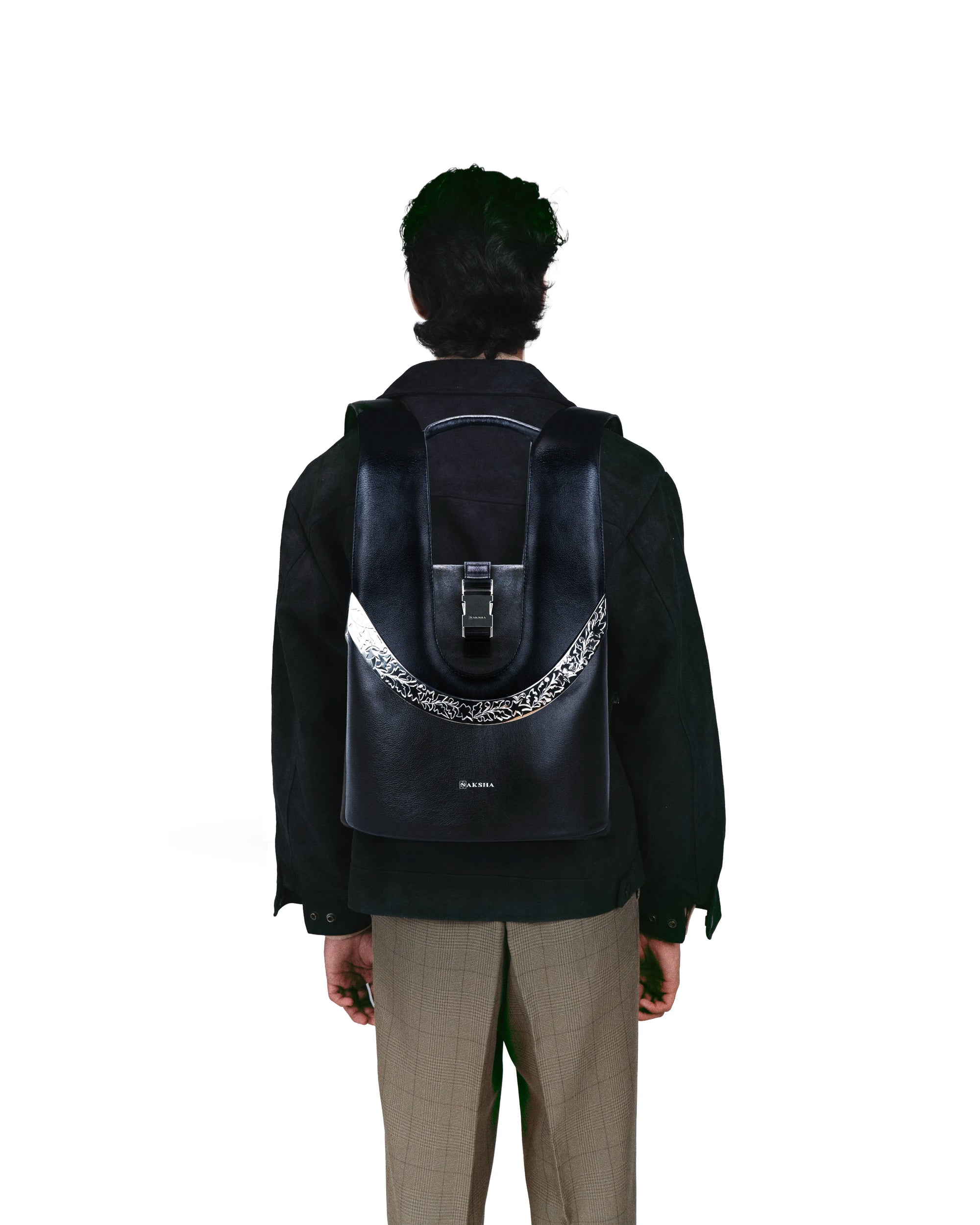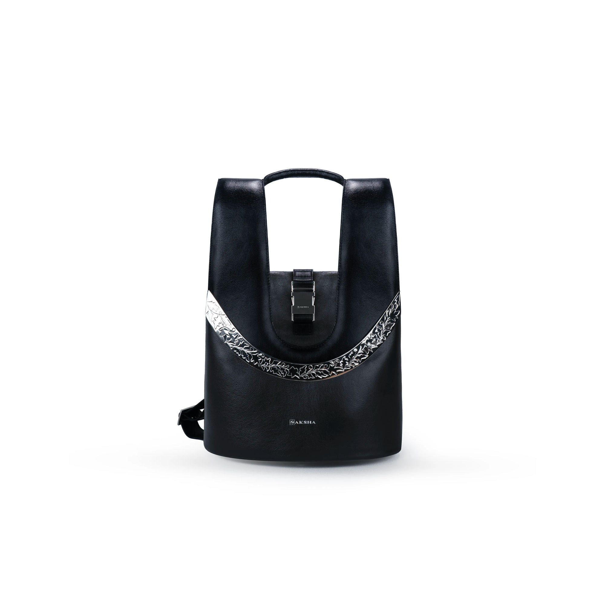 The Arch Mini Backpack is defined by its sculptural silver-plated hardware, shaped like an arch. Intricately hand-engraved by Bengal’s brass artisans, with floral motifs of the craft. Can be worn on both, the back or the shoulders and features a buckle closure.