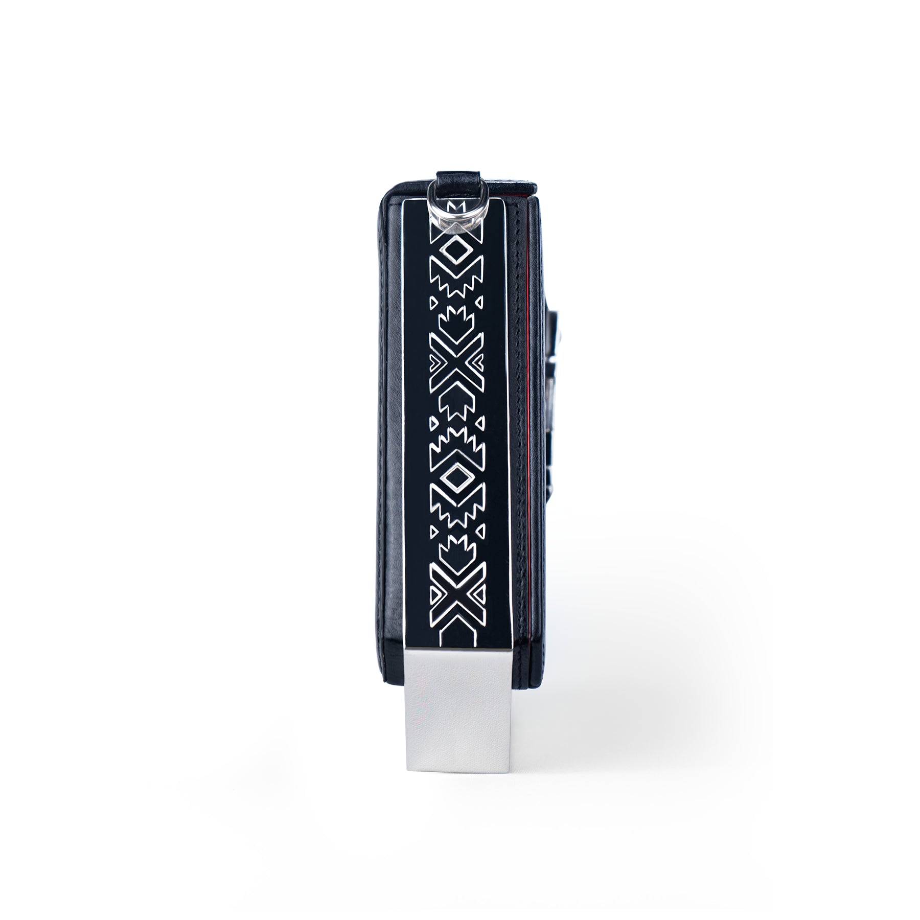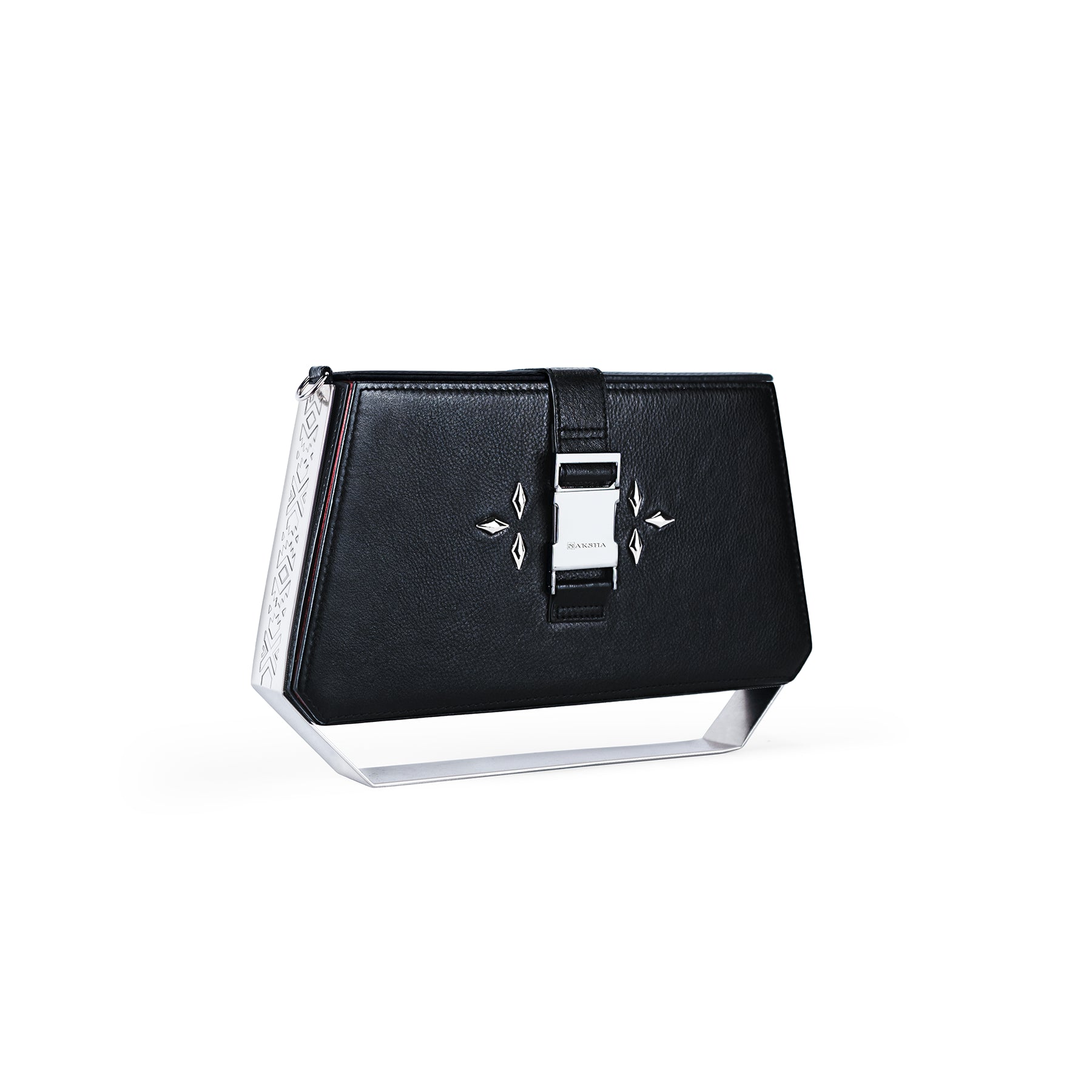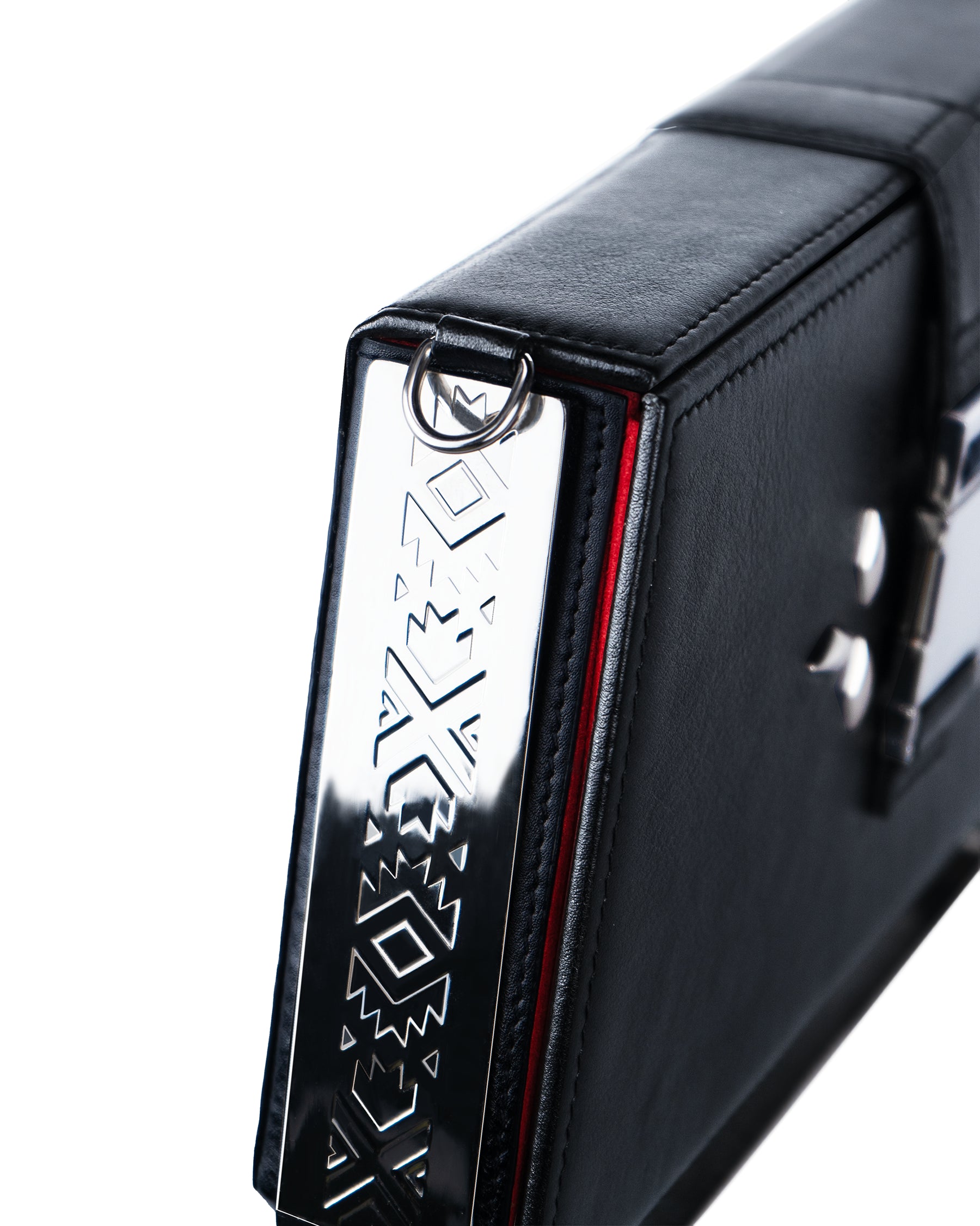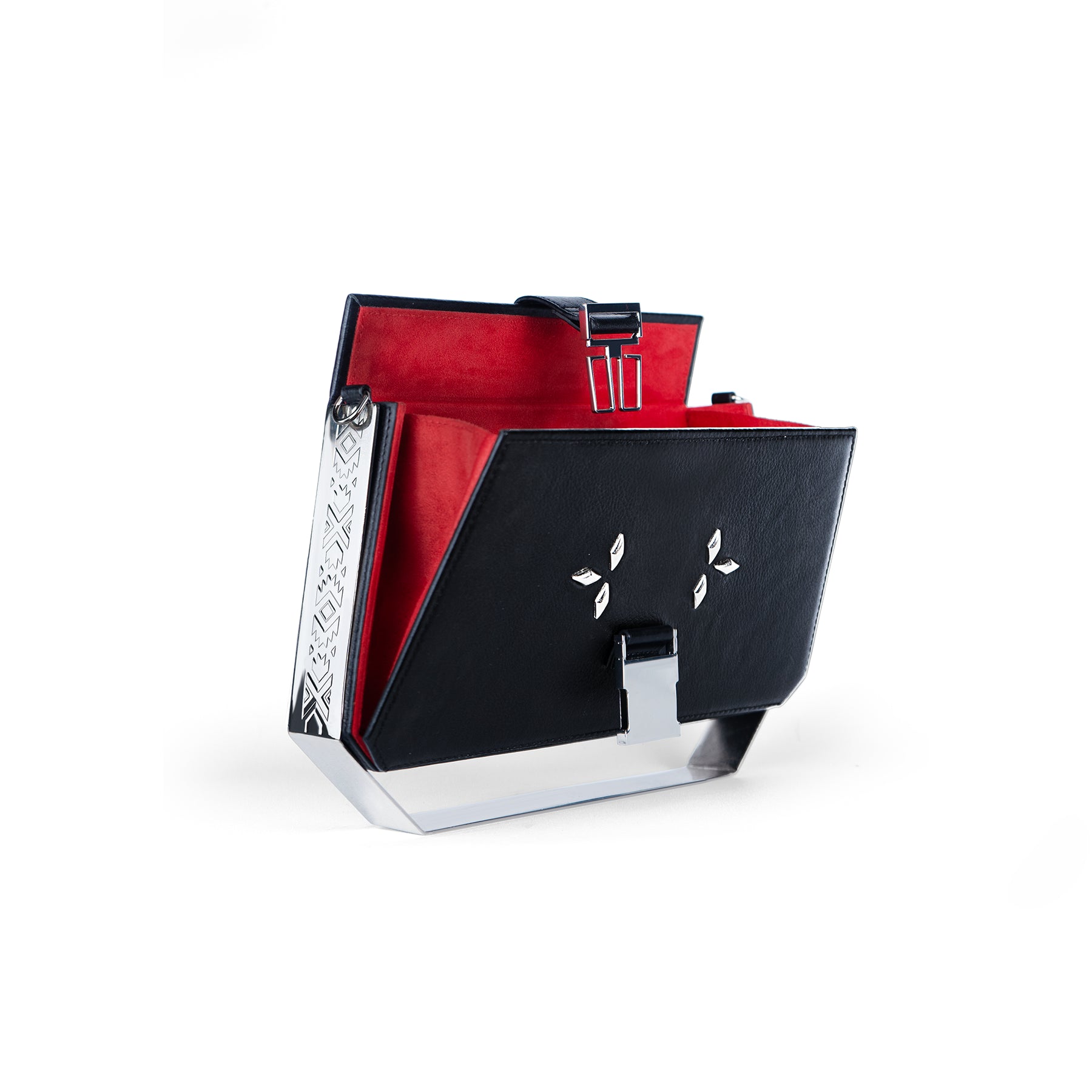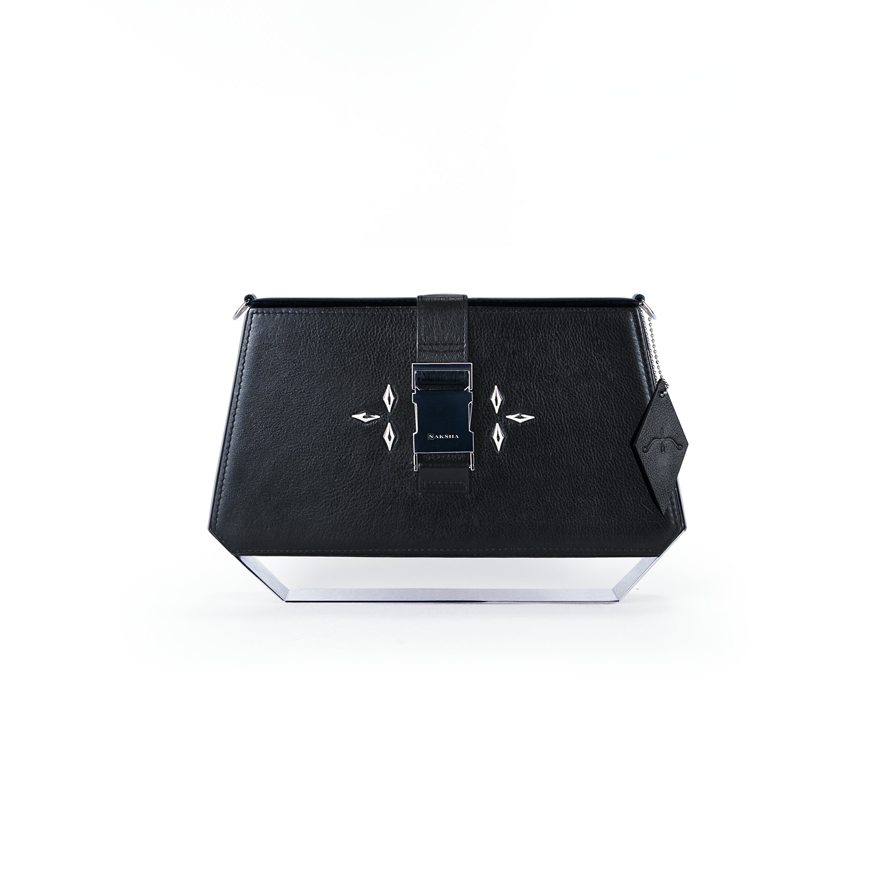 Baksa references traditional Indian storage trunks. Etched brass frame over extended handwork.