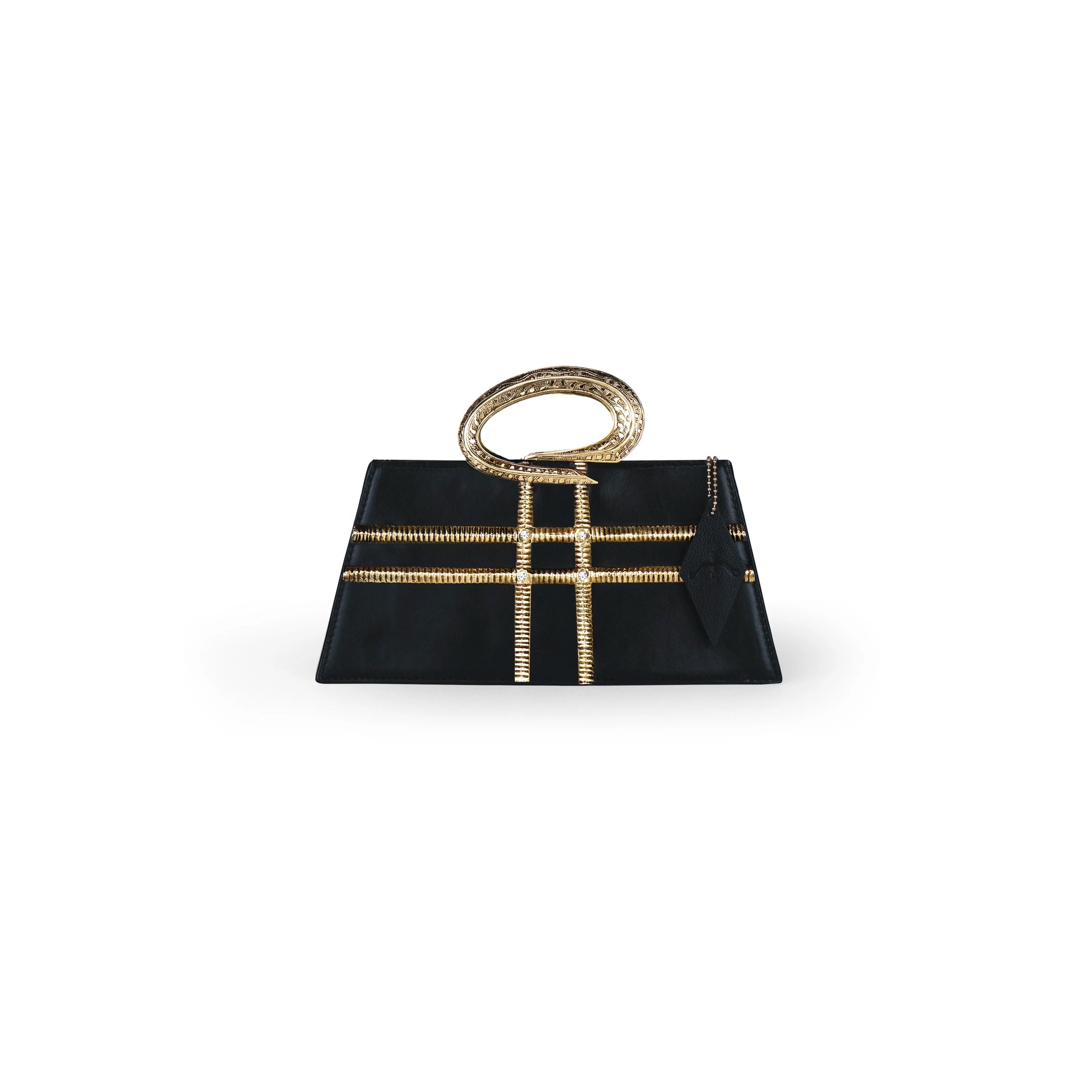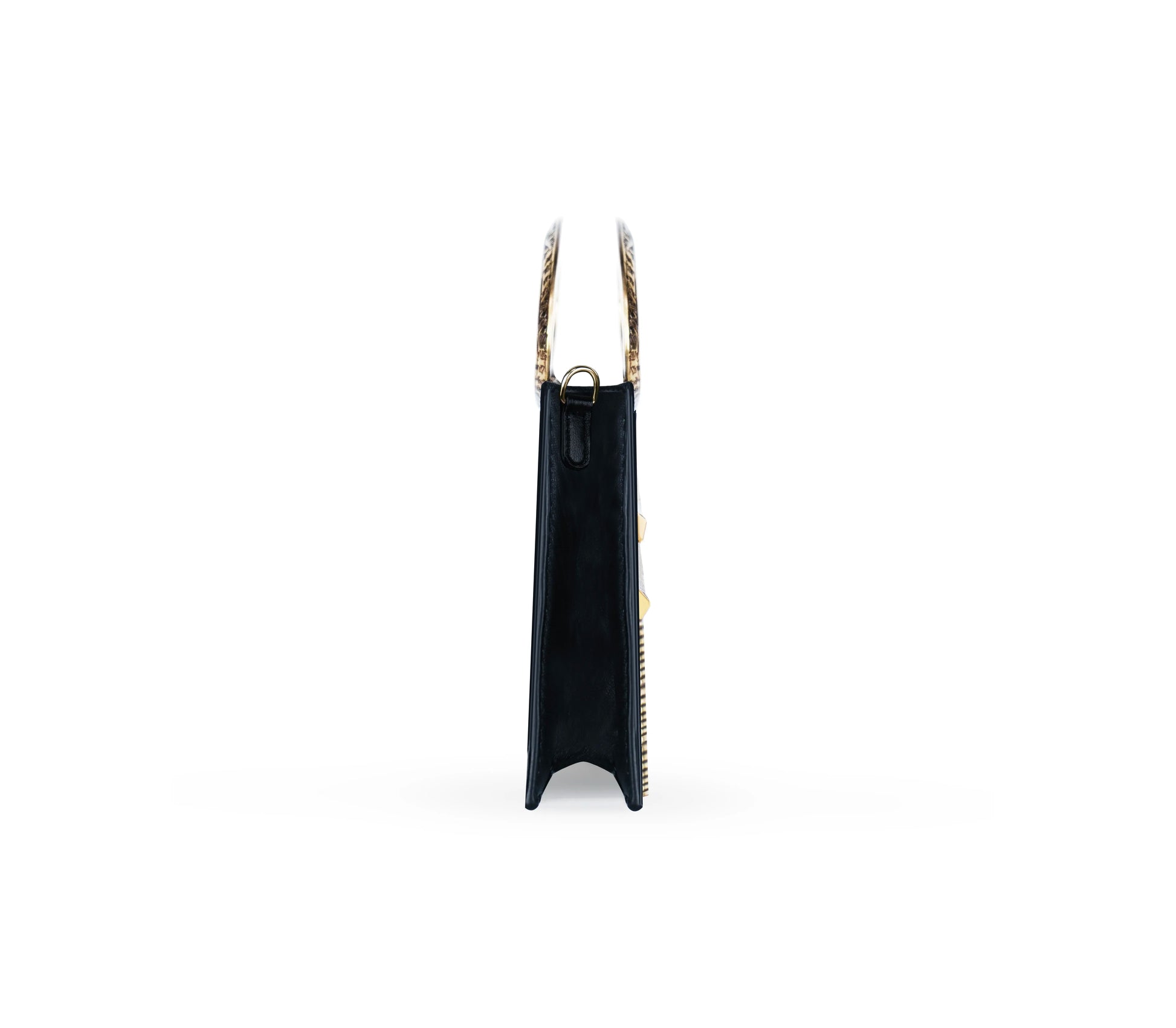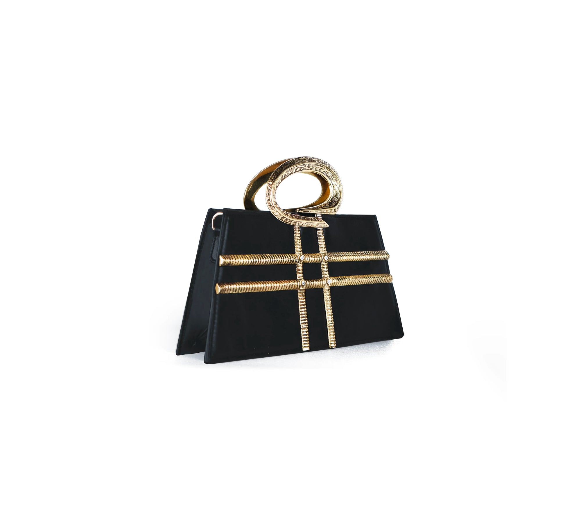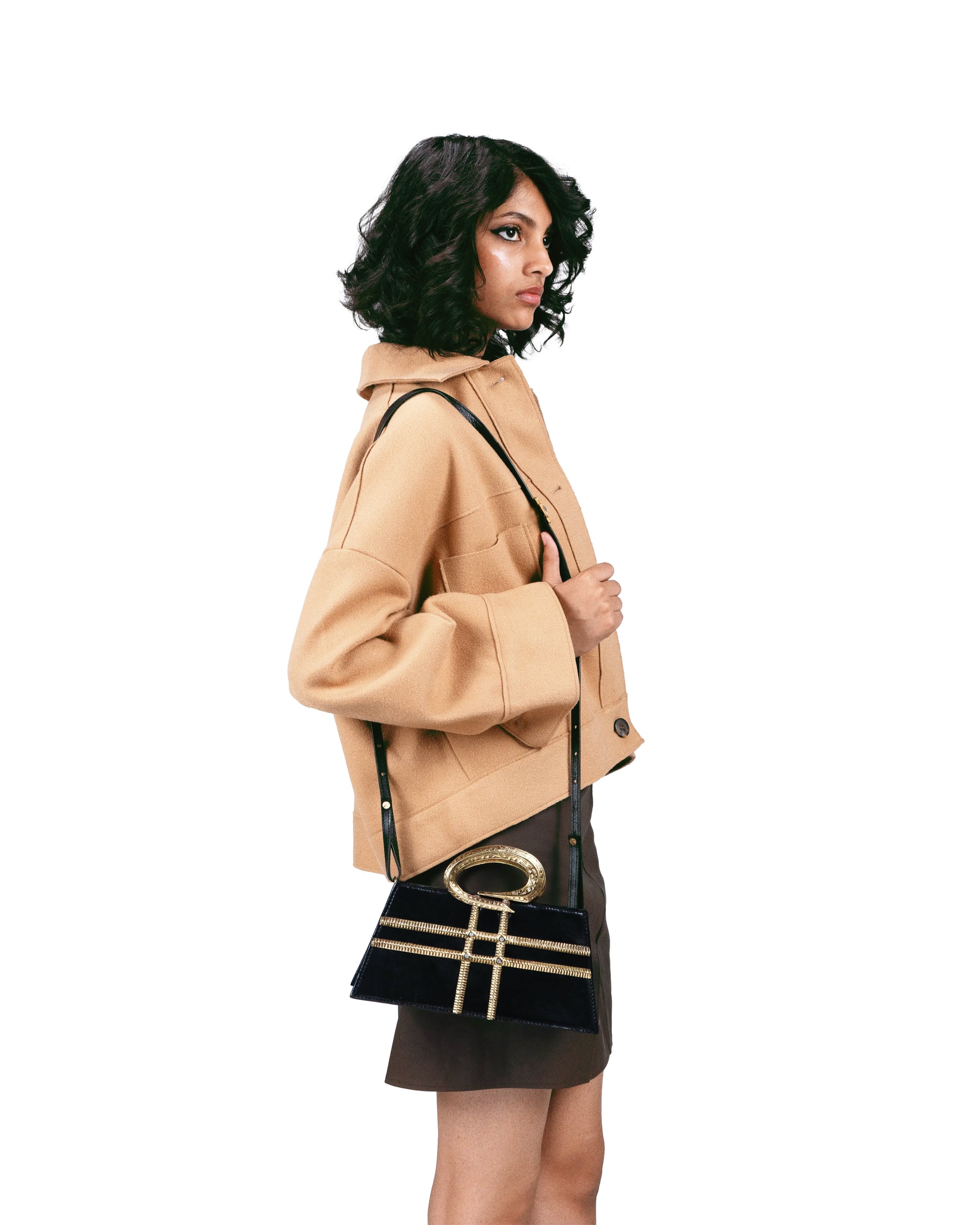 Disha- meaning ‘direction’, is a clutch that symbolises journeys and movement. Its form is framed by brass elements that wrap the body in clean, intersecting lines. Inspired by crossings and pathways.