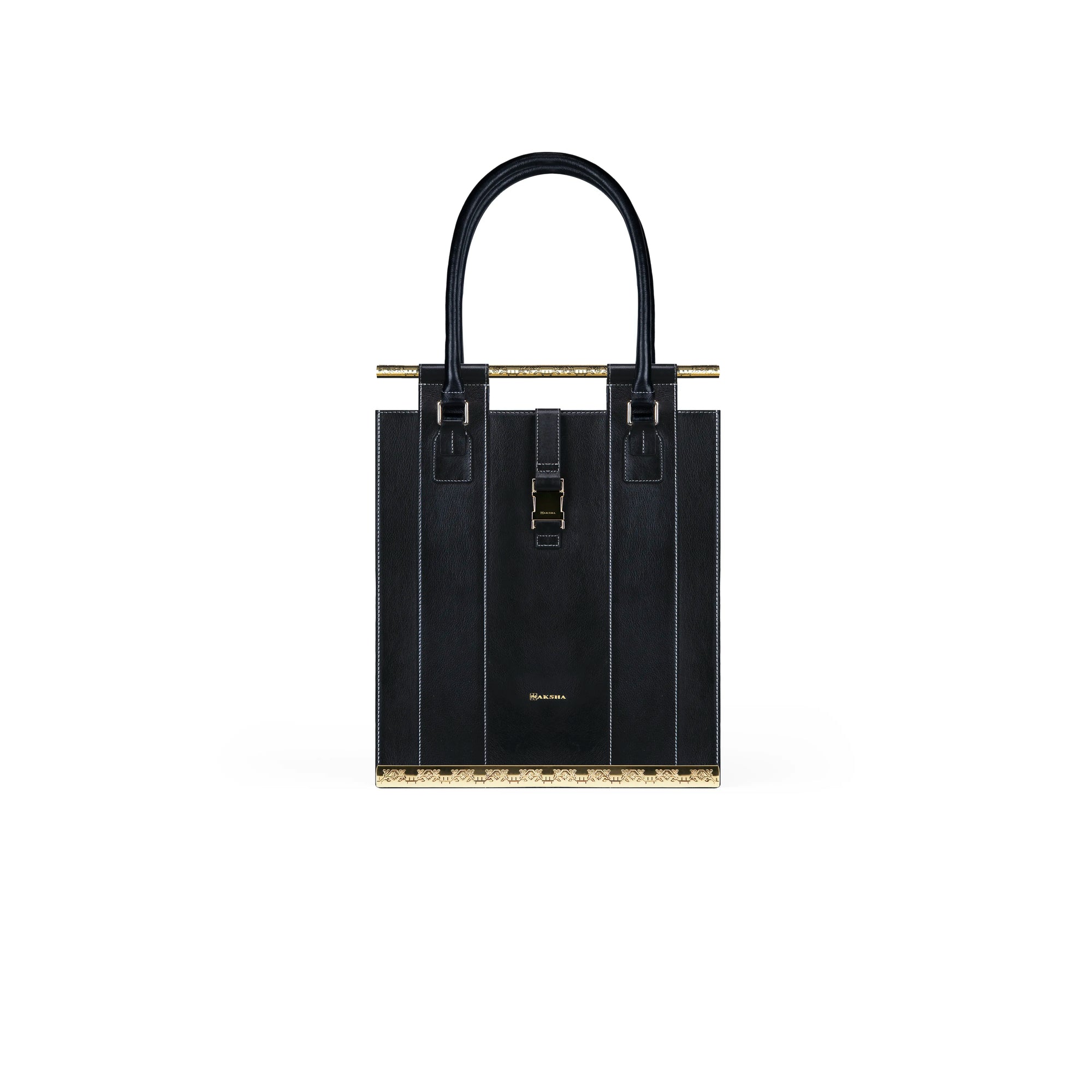 Structured full-grain leather tote with acid-etched brass detailing, a leather top handle, and a central leather buckle fastening. The brass elements are etched with traditional motifs of the craft.