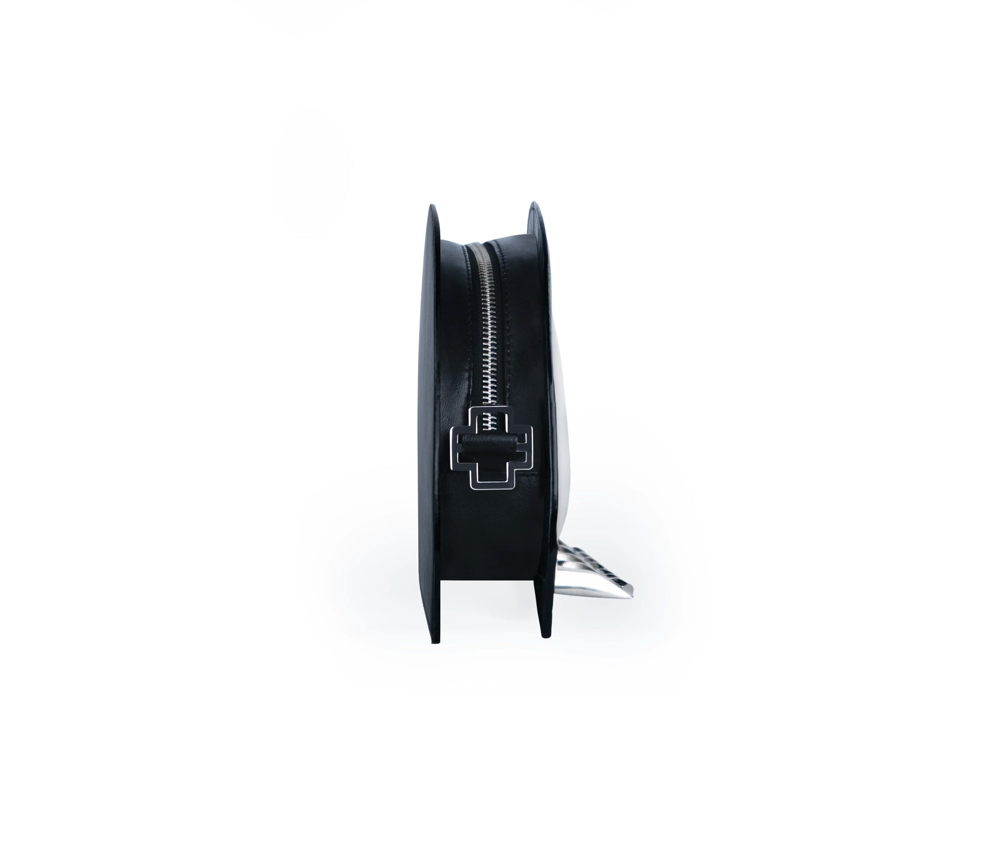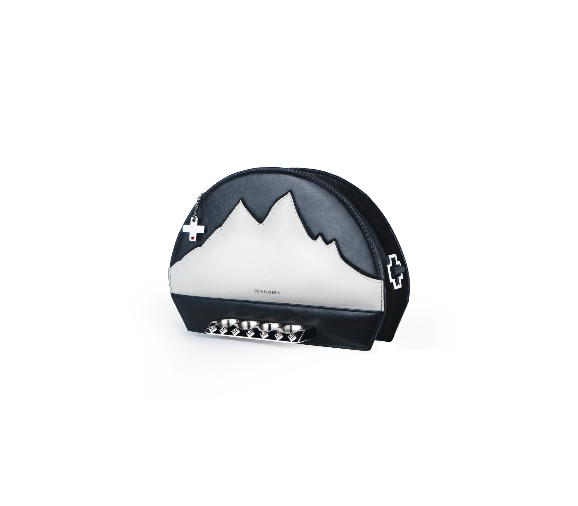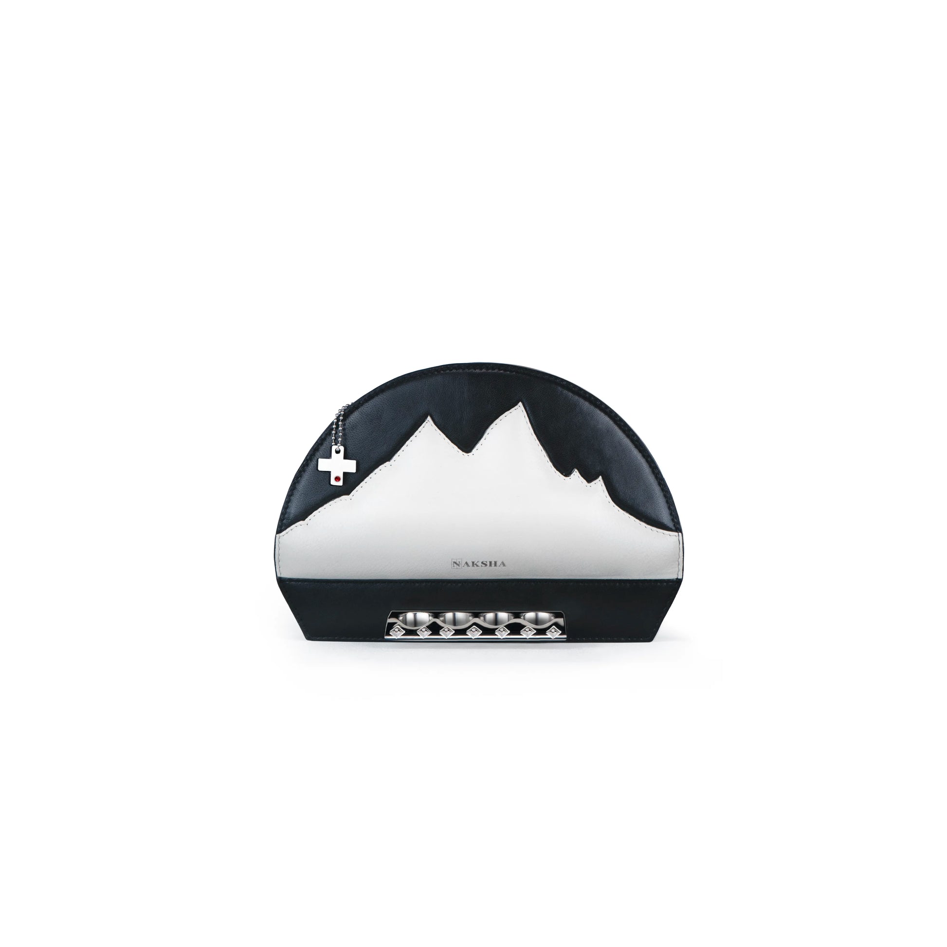 The Knuckle Bag features a curved, mountain-inspired silhouette with layered leather detailing that suggests the outline of distant peaks. Its silver-plated knuckle handle, engraved with geometrical motifs, acts as both a functional grip and a distinctive design element.